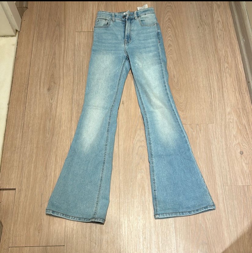 Açık mavi renkli bol paça denim pantolon, retro ve rahat tarzda. Günlük kullanım için uygun, konforlu ve zahmetsiz şıklık sunar.
