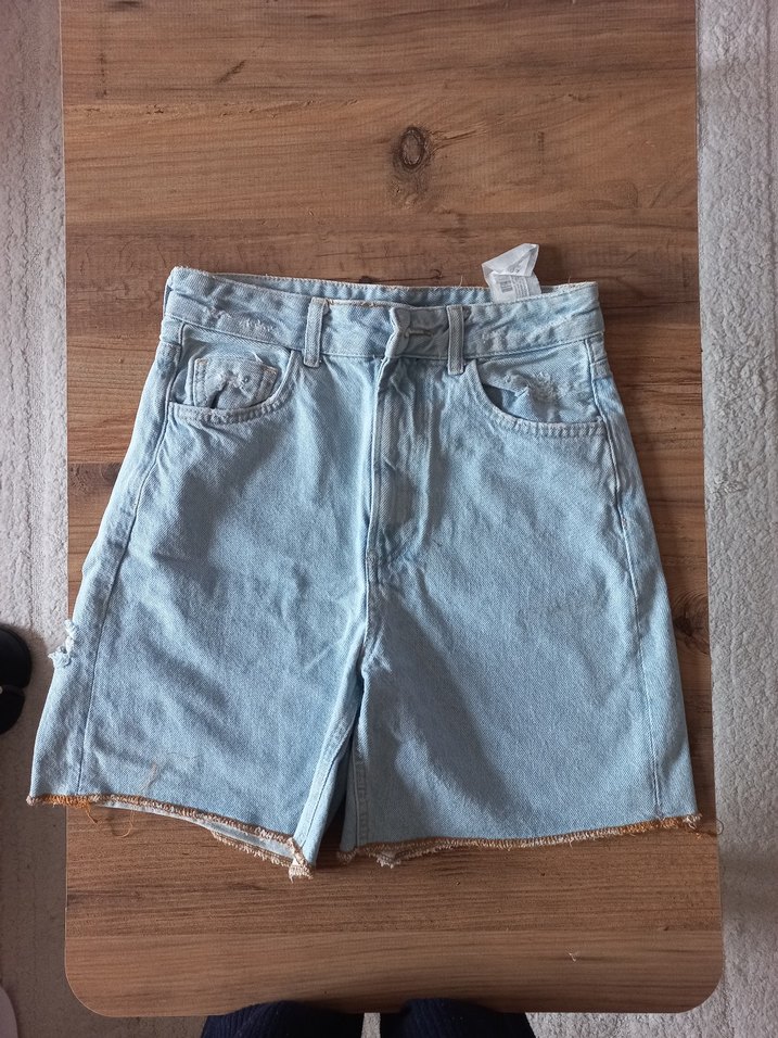 Kadınlar için açık mavi renkli, bol kesim denim mini şort. Günlük kullanıma uygun, rahat ve şık sokak stili.