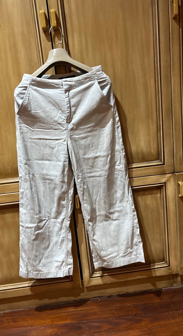 Açık mavi renkli, keten kumaştan, bol kesim midi uzunlukta kadın pantolonu, günlük rahat kullanım için sade tasarım