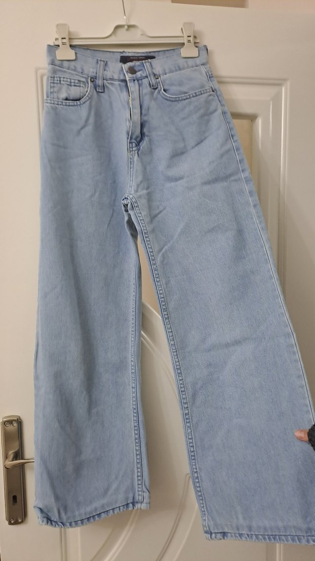 Açık mavi renkte, midi boy ve bol kesim denim pantolon. Günlük kullanıma uygun, rahat ve şık bir görünüm sunar.