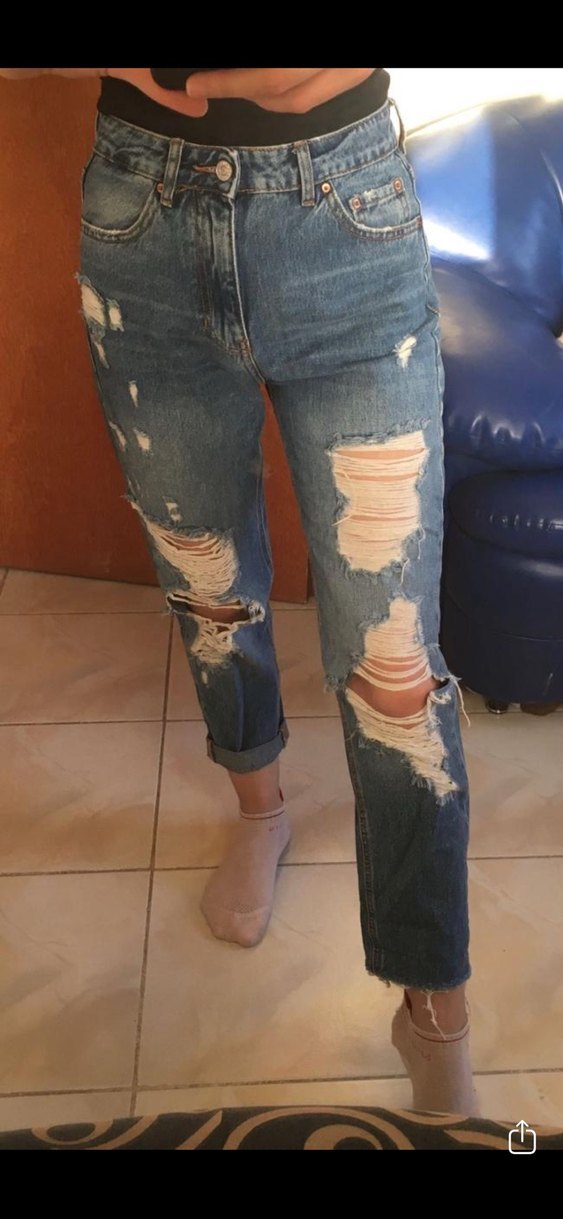 Açık mavi renkte, bol kesim ve normal boyda denim pantolon. Yırtık detaylı ve kemerli tasarımıyla günlük sokak modasına uygun.