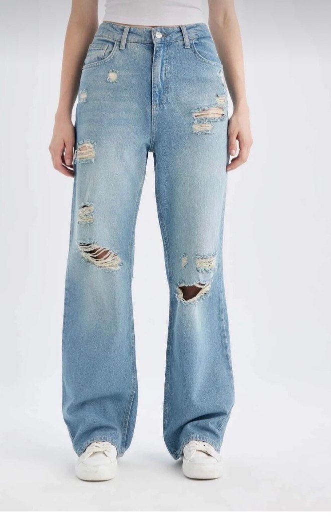 Kadınlar için bol kesim, açık mavi denim ve yırtık detaylarla günlük kullanıma uygun sokak stili jean.