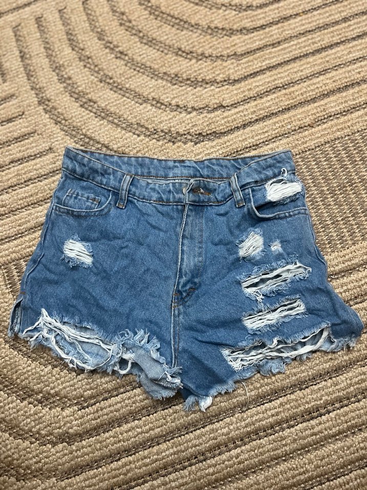 Açık mavi kot şort, bol kesim ve yırtık detaylarla rahat ve şık bir görünüm sunar. Günlük sokak stili için uygundur.