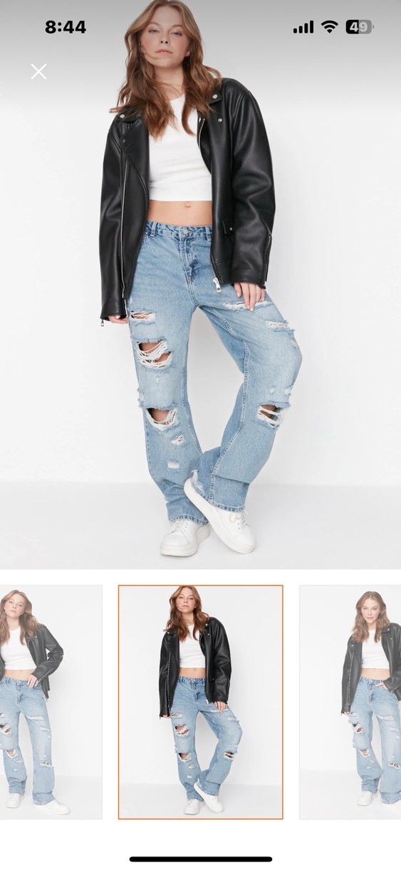 Açık mavi kot pantolon, salaş kesim ve yırtık detaylarla rahat ve şık bir görünüm sunar. Normal midi boyda, günlük sokak stiline uygundur. Beli çok bol geldiği için daralttırma yapılmıştır