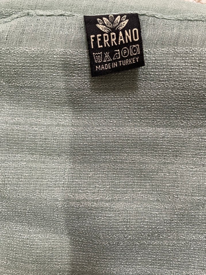 Kadınlar için açık yeşil kumaştan, bohem tarzda, Velcro kapamalı şal. Tesettür ve Paris etkisi taşır. Üzerinde "FERRANO, MADE IN TURKEY" etiketi bulunur.