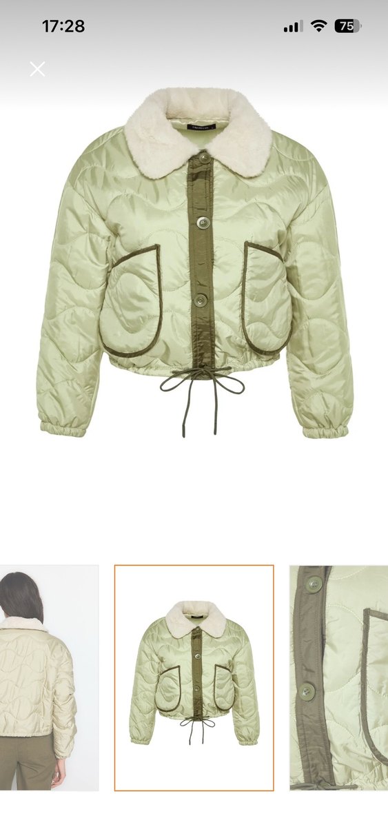 Kadınlar için açık yeşil renkte, peluş detaylı notched yaka kışlık mont. Yumuşak fleece kumaştan, bol kesim ve uzun kollu, kısa boylu. Büyük cepleri ve ayarlanabilir bel ipi bulunur.