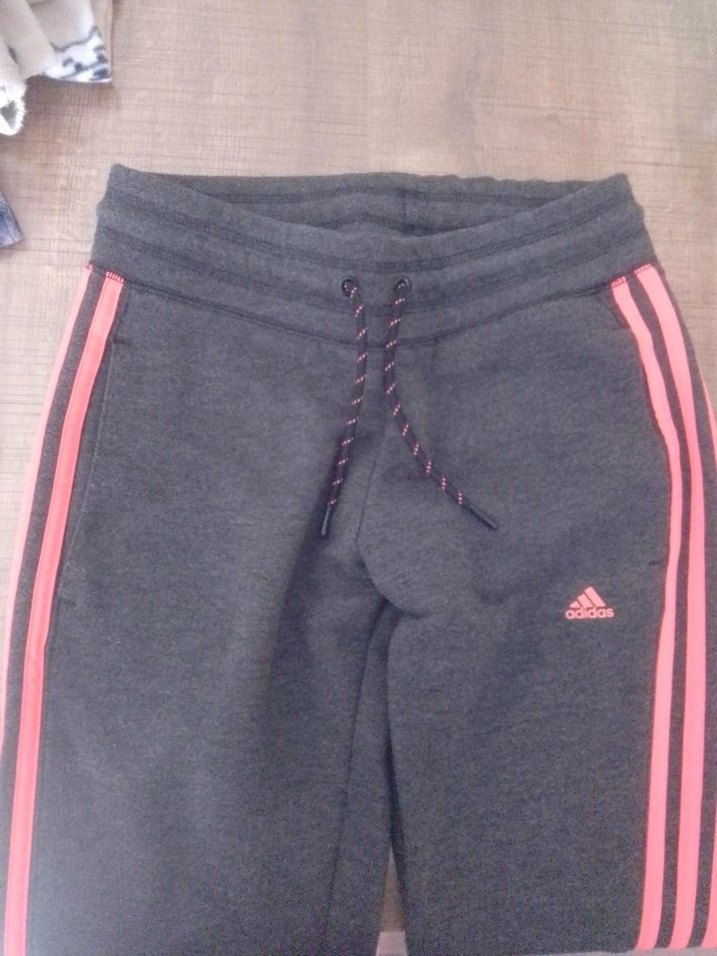 Kadınlar için gri renkli, pembe yan şeritli, elastik bel ve bağcık detaylı, yumuşak ve sıcak kumaştan yapılmış Adidas eşofman altı. Spor ve günlük kullanım için uygundur. ♀️