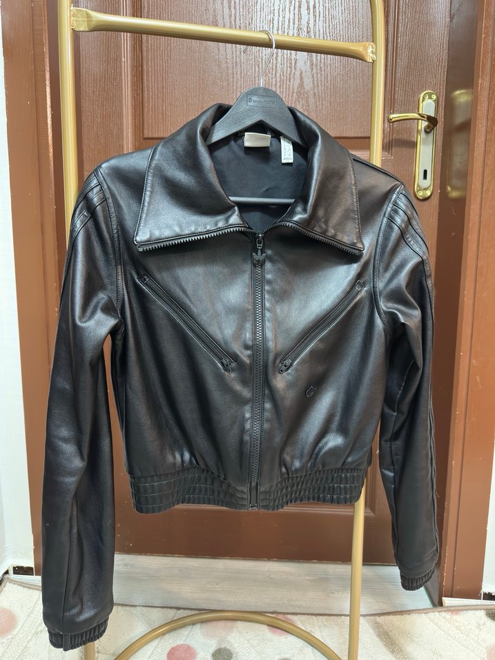 Fermuarlı, kuşaklı, uzun kollu, kesik yaka, siyah biker tarzı dar kesim kadın deri ceket. Orjinal Adidas ürünüdür hiç bir deformesi yoktur.