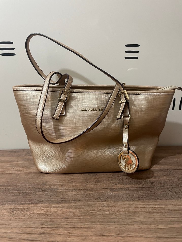 Parlak altın renkli deri, tokalı askılı ve baskılı detaylara sahip kadın çantası. Modern klasik ve Paris tarzını yansıtır.