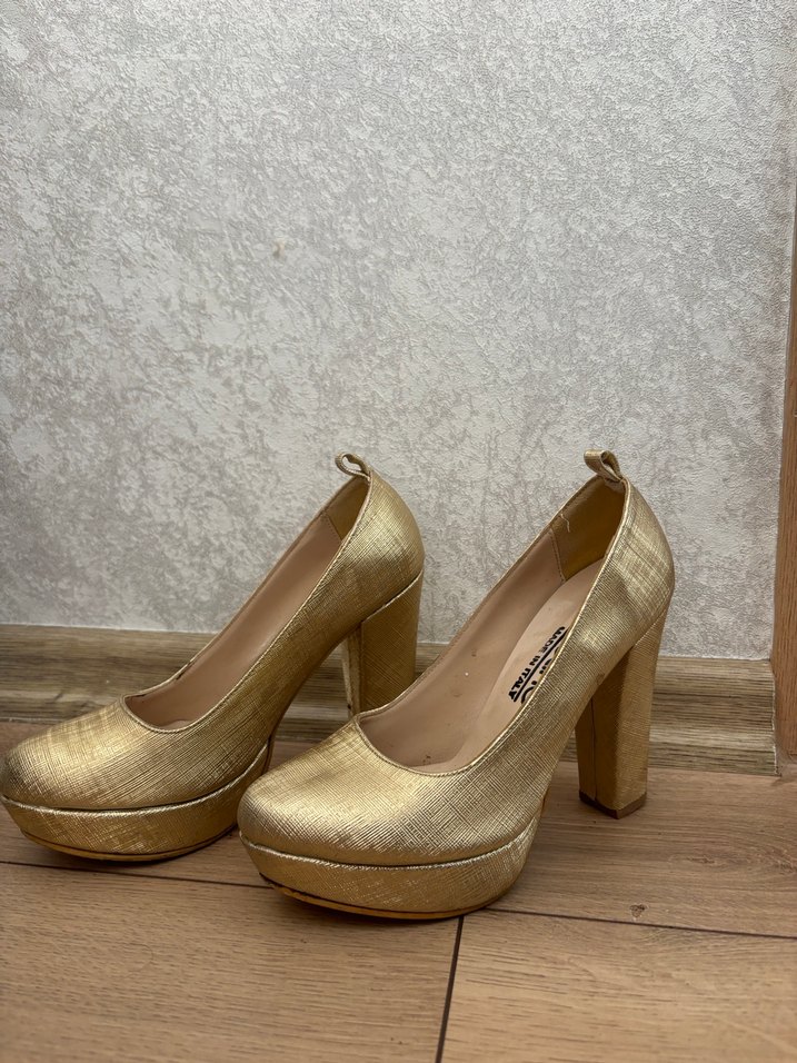 Düğünler için parlak yüzeye sahip, ipeksi altın platform topuklu ayakkabılar, modern klasik tarzda ve zahmetsiz şıklık sunar.