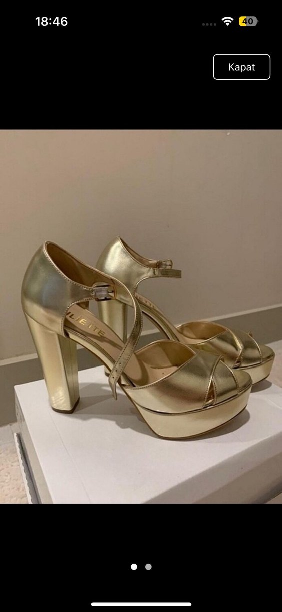 Altın renkli, parlak platform topuklu ve tokalı ayakkabılar. Kauçuk malzemeden üretilmiş, düğün ve özel günler için uygun.