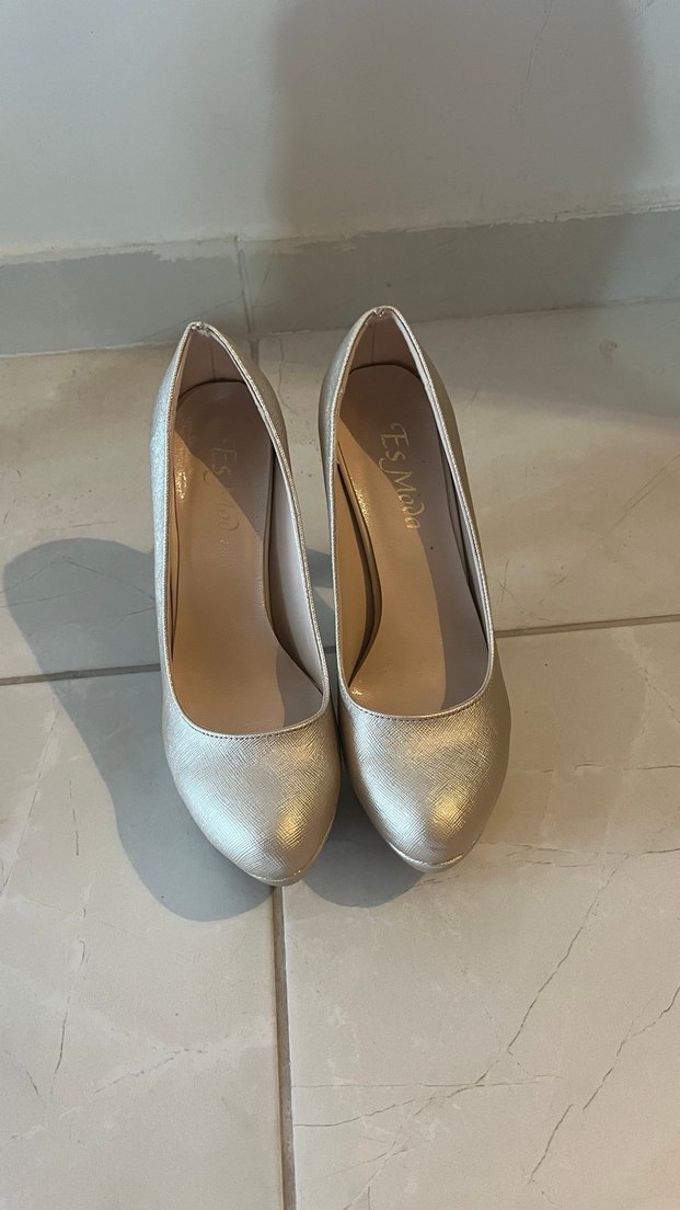 Düğünler için parlak metal kaplama altın platform topuklu ayakkabı. Minimalist, desensiz ve modern klasik tarzda kolay şıklık sunar.