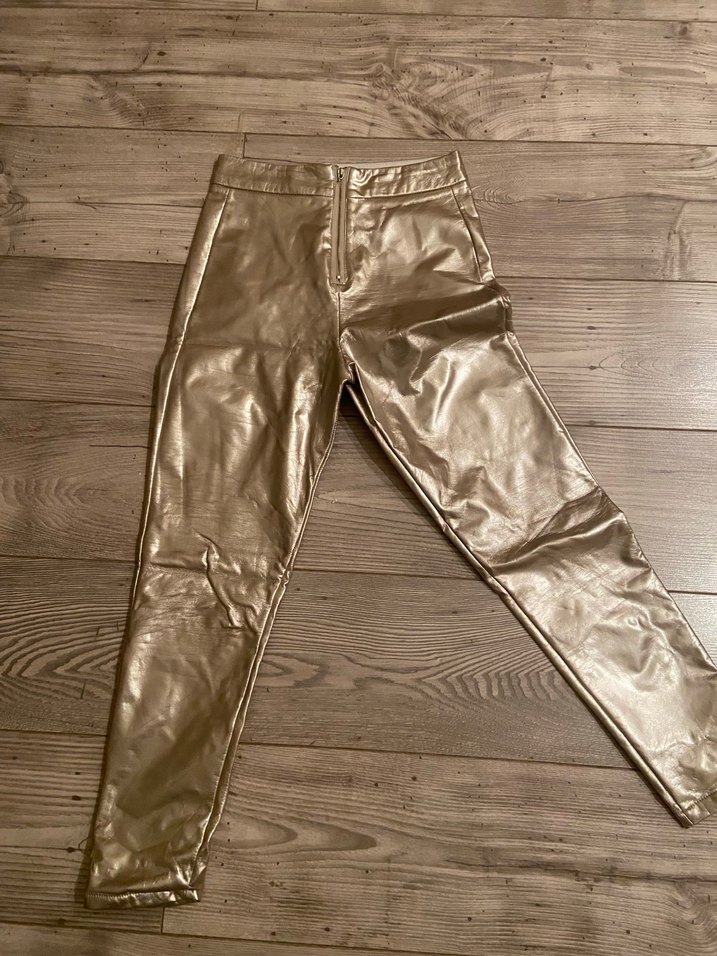 Fıt kesim, altın rengi deri cigarette pantolon, parlak metalik dokusuyla midi boyda. Paris tarzı ve romantik buluşmalara uygun şık bir seçim. ✨