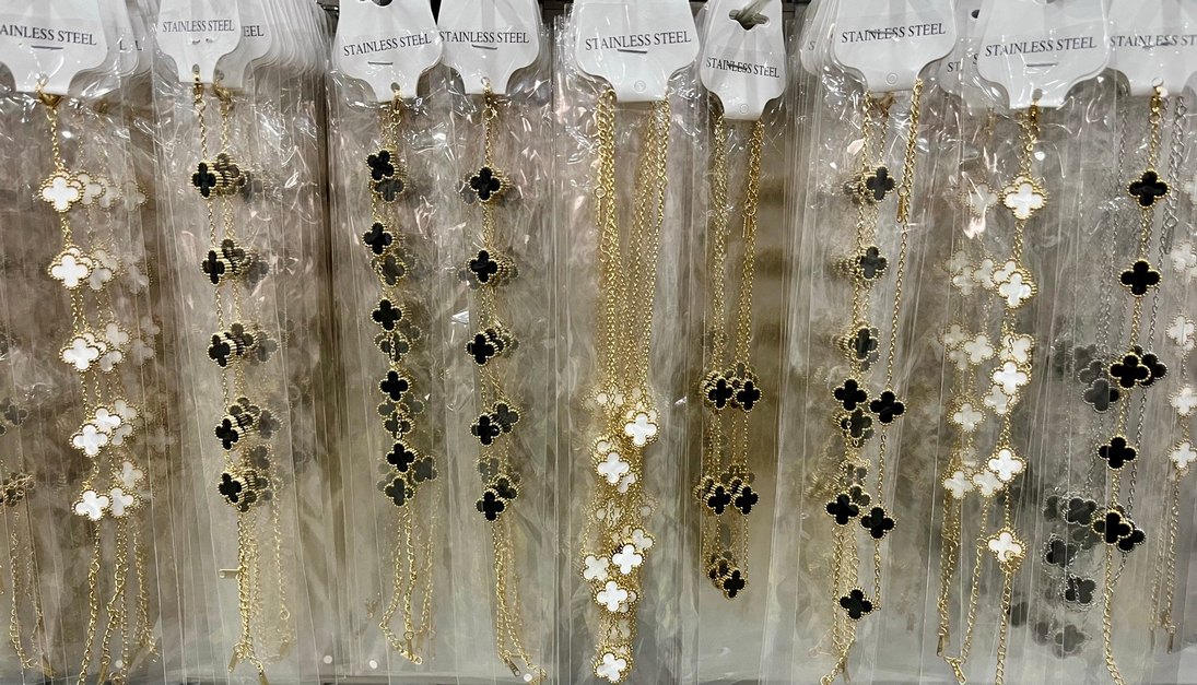 Paslanmaz çelikten, zincir detaylı altın renkli, siyah ve beyaz yonca nakışlı kadın el aksesuarları. Bohem Paris tarzı için uygun. ✨