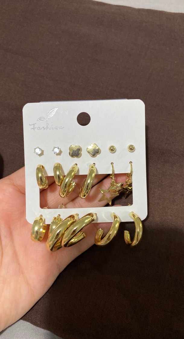 Günlük kullanıma uygun, minimal ve bohem tarzda, kısa uzunlukta altın renk mini halka ve işlemeli payetli küpe seti.✨ hiç kullanılmadı