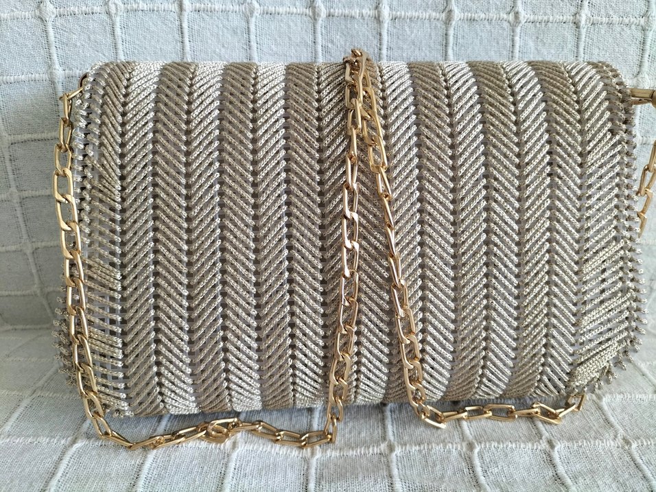 Altın renk zincir detaylı kadın el zinciri, nakışlı gri kumaş üzerinde. Bohem tarzda, Paris etkisiyle günlük kullanıma uygun. ✨