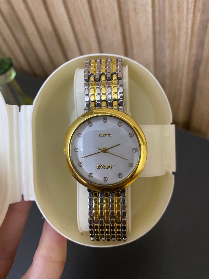 Kadınlar için parlak altın renkli çerçeve ve boncuk detaylı iki renkli metal kayışa sahip klasik saat. Beyaz kadran ve sade saat işaretleriyle modern klasik şıklık sunar. ⌚