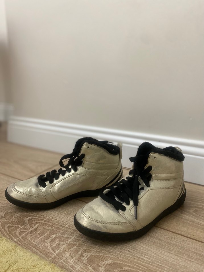 Kadınlar için parlak altın renkli, dolgu topuklu ve cırt cırtlı spor ayakkabılar, günlük rahat kullanım için sokak tarzında.