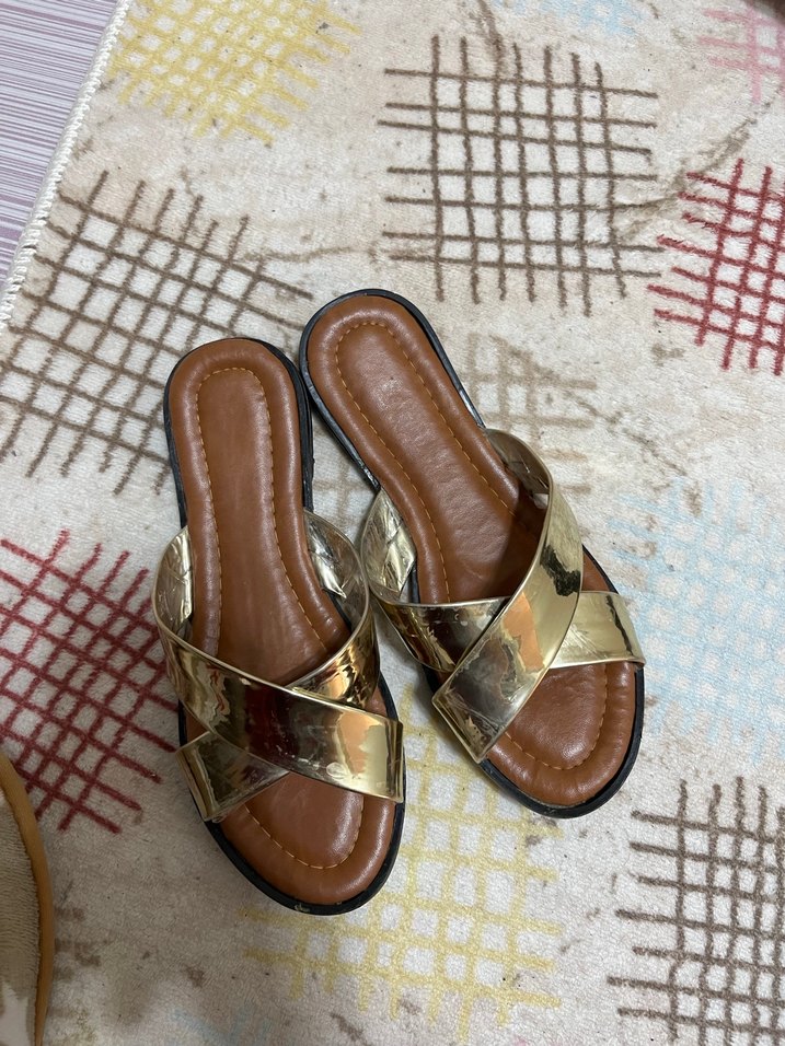 Kadınlar için parlak altın renkli, yılan desenli kauçuk terlikler. Dolgu topuklu ve tokalı, rahat kahverengi tabanlı günlük kullanım için uygun. Yeni gibi az kullandım