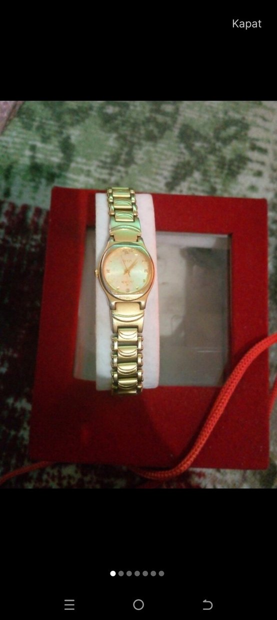 Altın renkli, kemerli tasarıma sahip kadın kol saati, minimalist ve klasik zarafet stilini renkli ve karşıkültür unsurlarıyla birleştirir. ⌚ ekranı biraz çizik olmuş uzmandır takmadım için bili bitmiş takılır