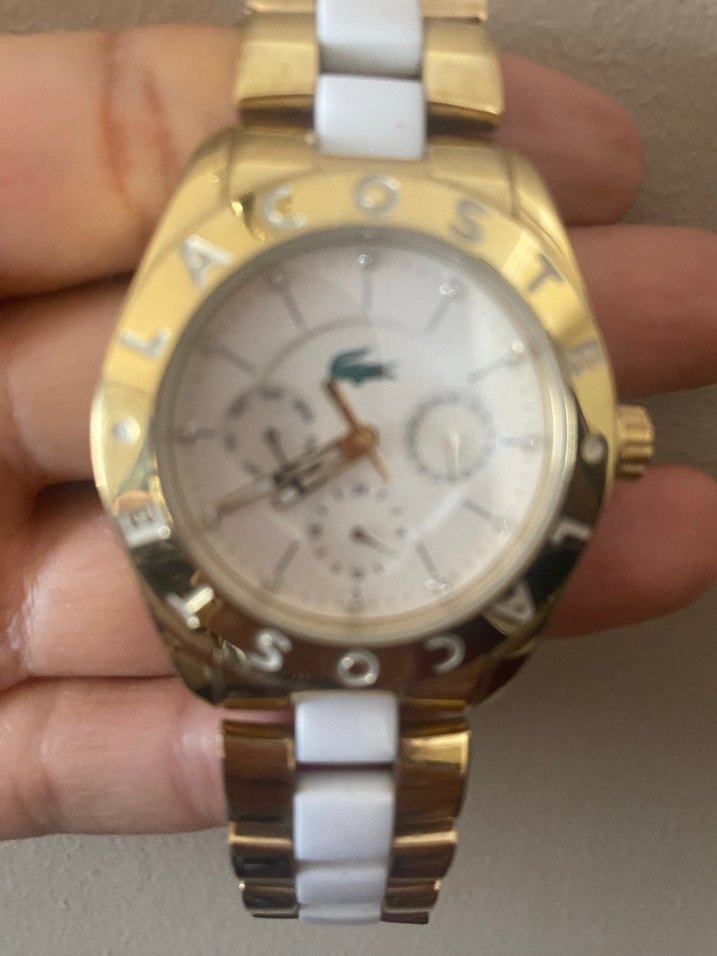 Kadınlar için altın ve beyaz renkli, tokalı Lacoste kol saati. Klasik zarafeti Paris sokak modasıyla buluşturur. Çoklu alt kadranları ve Lacoste logosu bulunur. ⌚