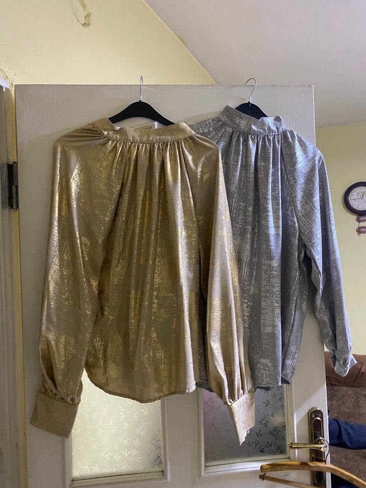 Kadınlar için parlak altın renkli, yüksek yakalı ve uzun kollu bluz. İpek gibi kumaştan, bol kesim ve drapeli tasarıma sahip, ofis için uygun. Renk için ilan açtırınız.