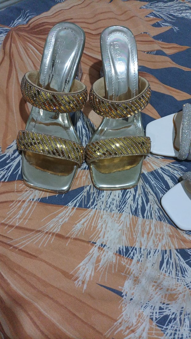 Altın renkli, payetli detaylara ve parlak yılan deseniyle süslenmiş blok topuklu kadın ayakkabısı, düğün ve şık etkinlikler için uygun.