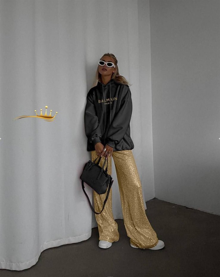 Kadınlar için parlak altın renkli, baskılı desenli ve ipeksi dokulu salaş düz kesim pantolon. Sokak stiline uygun rahat bir model. ✨