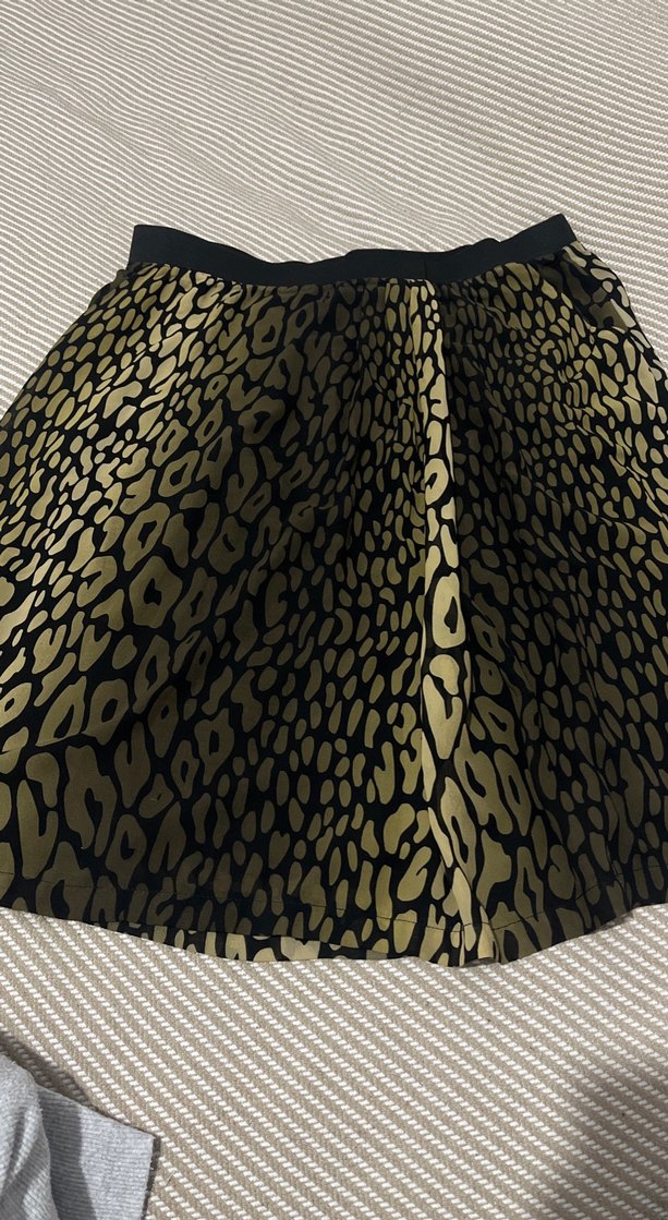 Kadınlar için koyu altın yılan desenli midi etek, sentetik kumaştan ve bol kesimlidir. Kürk detaylarıyla modern bir tarz sunar, günlük kullanıma uygundur.