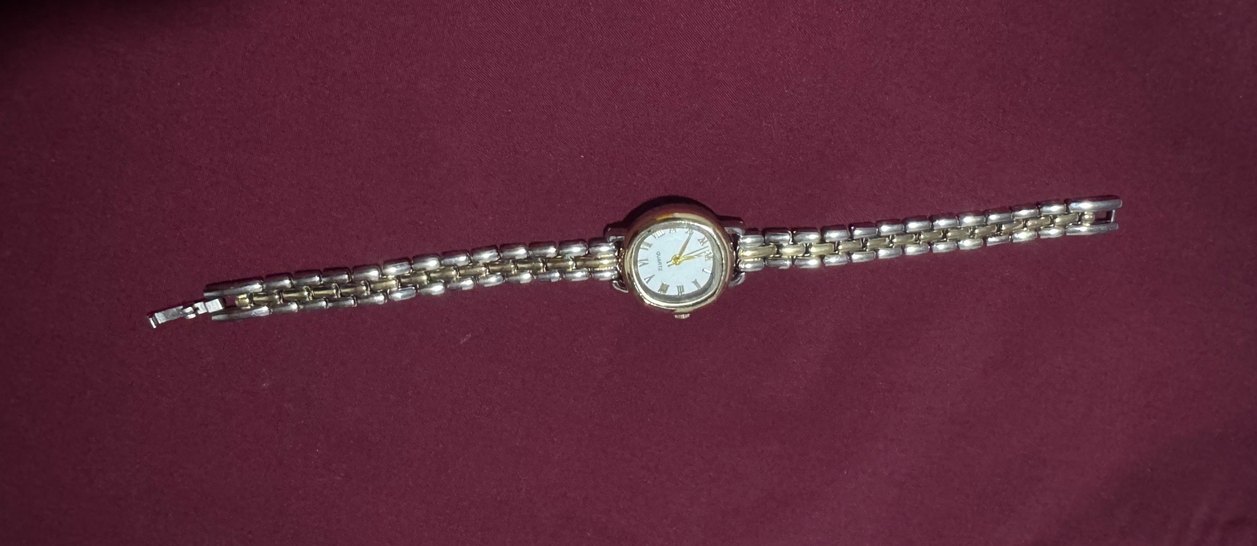 Altın ve gri renkli, kemerli bileziğe sahip kadın saati. Klasik yuvarlak kadran ve Roma rakamları bulunur. Çalışır durumda⌚