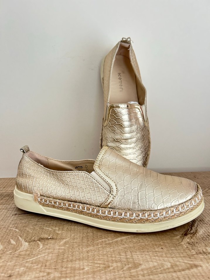 Altın renkli, parlak yılan derisi desenli deri espadriller. Dolgu topuklu ve fermuarlı, günlük kullanıma uygun. Ürünlerimi temiz ve sağlam şekilde muhafaza ediyorum. Siparişleri baloncuklu poşetle özenle ve güvenli biçimde paketliyorum. Her pakete küçük ek hediyeler ekleyerek kargoluyorum. Ayrıca sayfamdan toplu alımlarda indirim mevcuttur: 2. üründe %5, 3. üründe %15, 5. üründe %40 indirim uygulanmaktadır.