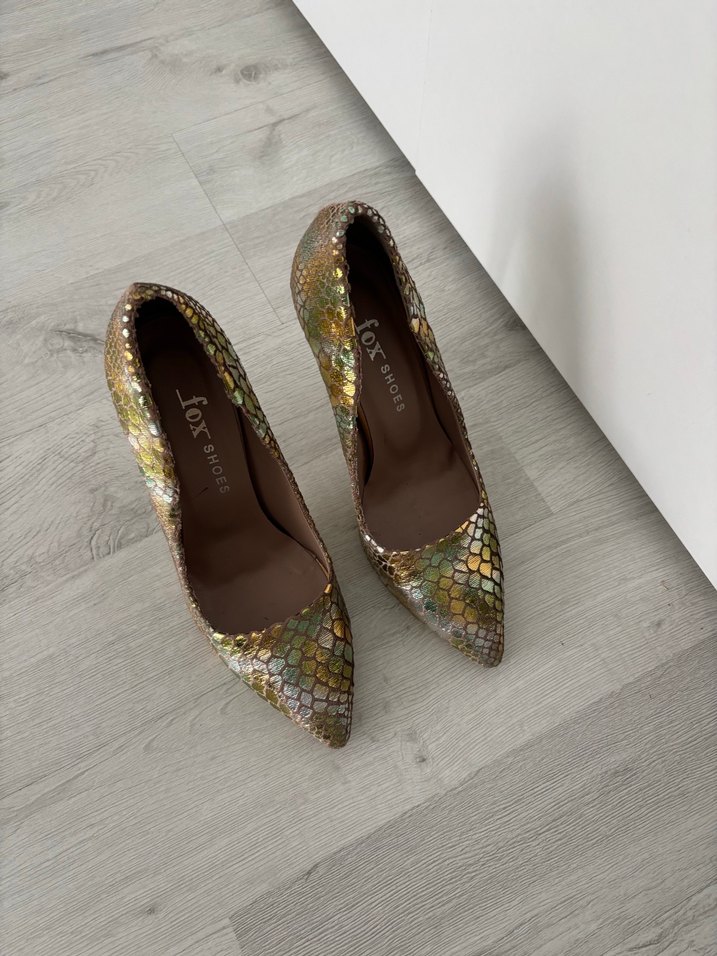 Kadınlar için parlak altın yılan derisi desenli, pul detaylı deri stiletto. Romantik akşamlar için çağdaş ve göz alıcı bir tarz sunar.✨ 12 cm topuk - 1 kez dügünde giyildi.