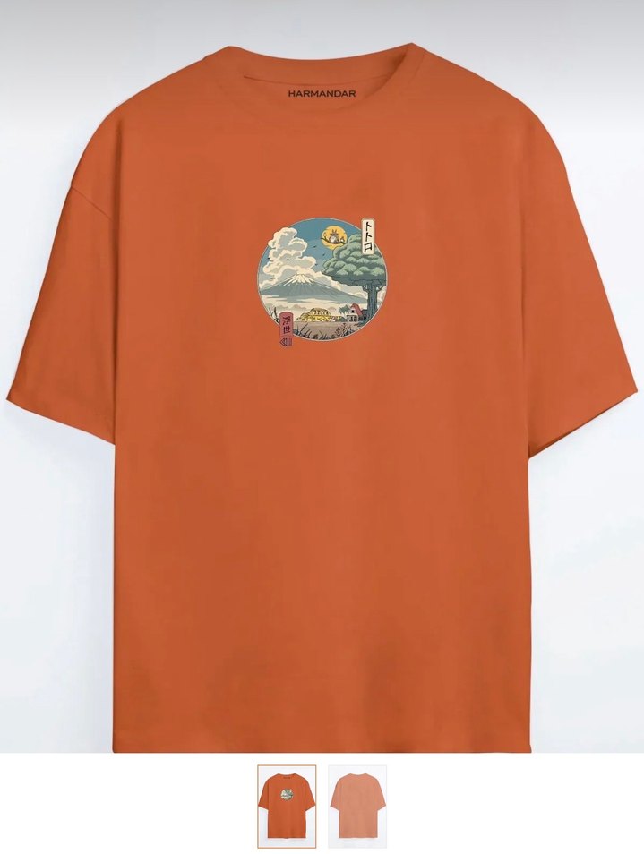 Pamuklu, kısa kollu, loose fit tişört. Yuvarlak yaka ve Totoro baskılı desenli, turuncu renkli.