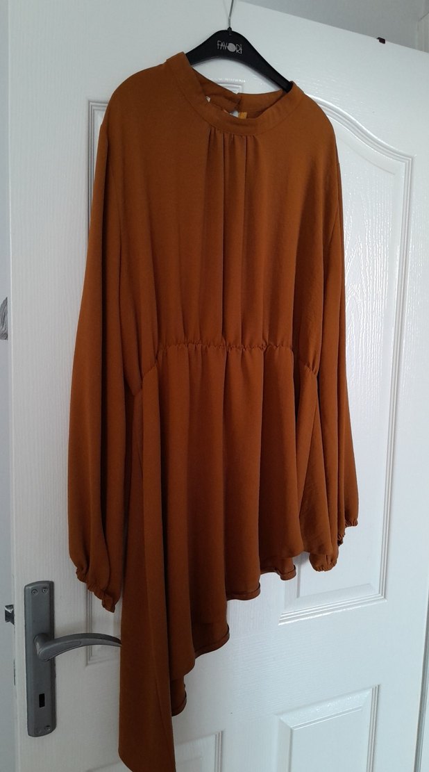 Kadınlar için uzun kollu, bisiklet yaka, dökümlü ve bol kesim kiremit rengi midi tunik. ayrobin kumaştan, asimetrik etek ucu ve günlük kullanım için uygun. beli lastikli ve çok rahat 50 bedene kadar olur . hamilelik için de kullanılabilir