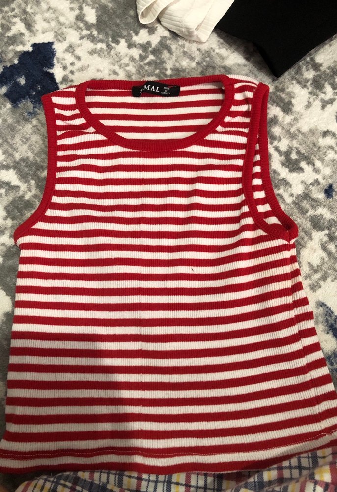 Kırmızı ve beyaz çizgili, triko dokulu, kısa ve dar kesim kadın atlet. Salaş olmayan, günlük sokak stiline uygun.