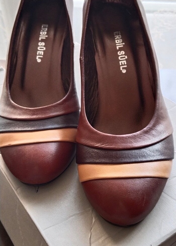 Orjinal deri ortapedik dolgu topuk ayakkabı. Erbil Süel ürünüdür. Hiç giyilmedi. Resimde görüldüğü gibi sıfır ayakkabı.