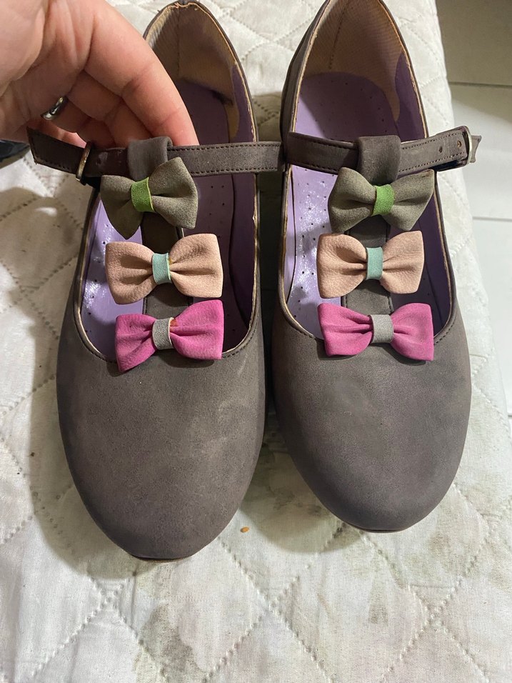 Gri süet malzemeden, blok topuklu kadın düz ayakkabılar. Önünde üç renkli fiyonk ve bilekten bağlama detayı bulunur. Günlük kullanıma uygun bohem tarzda.