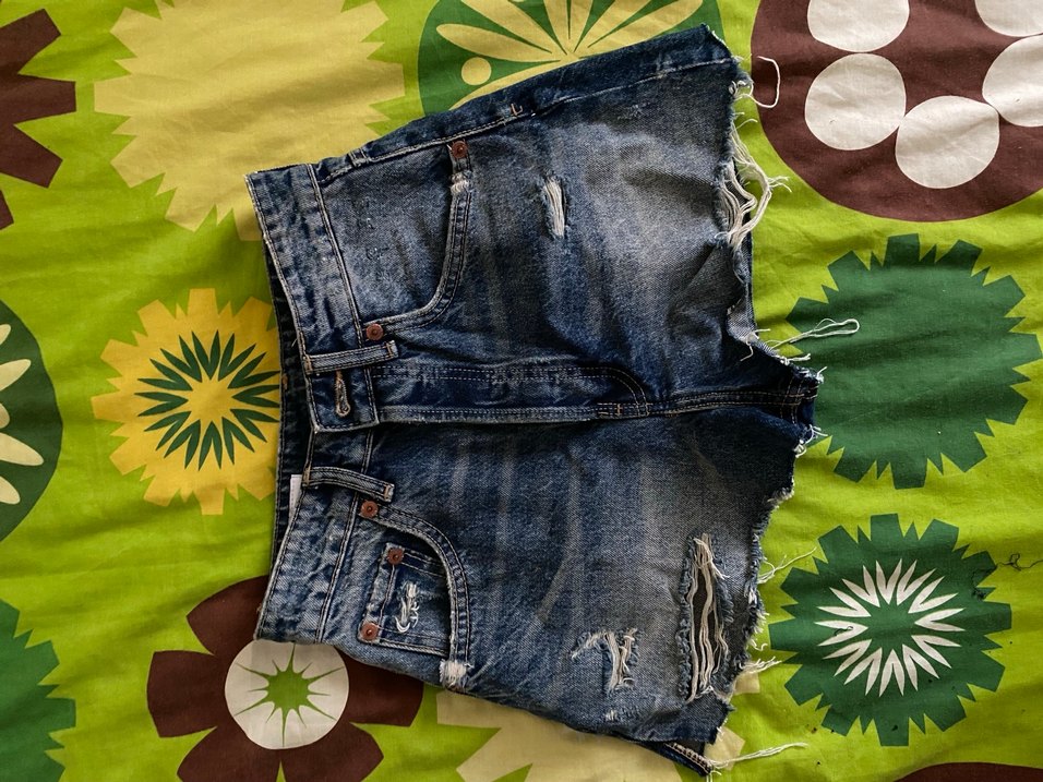 Bağcıklı, kopuk detaylı, bol kesim koyu mavi denim şort. Grunge tarzı ve tie-dye desenli, günlük rahat sokak modası için uygun.