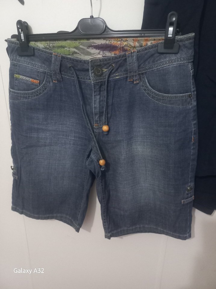 Bağcıklı bel ve gri tie-dye desenli, bol kesim mavi denim kısa şort, günlük sokak tarzı için uygundur. bel 41 cm basen 58 cm belden uzunluk47 cm