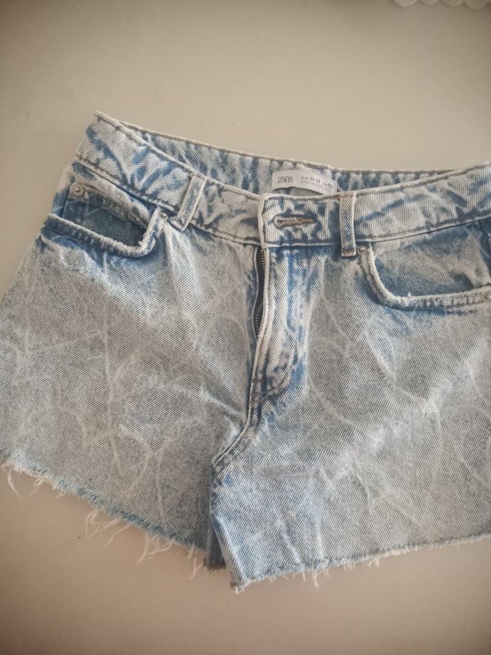 Bağlama desenli gri mavi renkte, düğmeli ve bol kesim mini kadın denim şort, günlük kullanıma uygun.