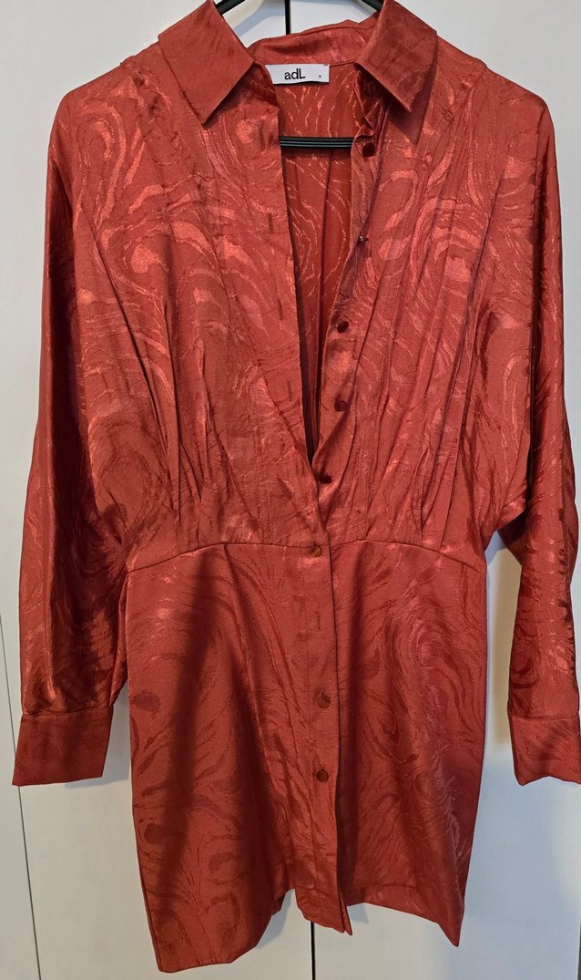 Kadınlar için parlak bakır turuncu, Metalik kiremit,Altin yansimali bakir saten kumaştan, V yakalı, uzun kollu ve düğmeli, bol kesim midi elbise. Bohem tarzıyla romantik akşamlar için ideal.