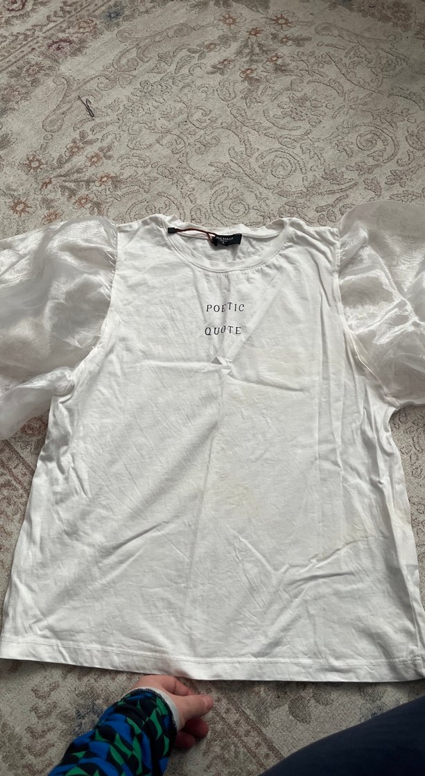 Kadın tişört, kısa kollu ve bol kesimdir. Önünde robalı detay ve şiirsel bir alıntı baskısı bulunur, rahat ve şık bir görünüm sunar. Kolları organze ve balondur