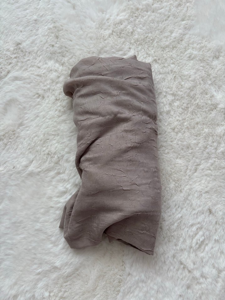 Yumuşak bambu kumaştan, peluş detaylı, bej-gri tonlarında kadın şalı. Sade ve temel bohem tarzı için uygundur. hiç kullanılmadı