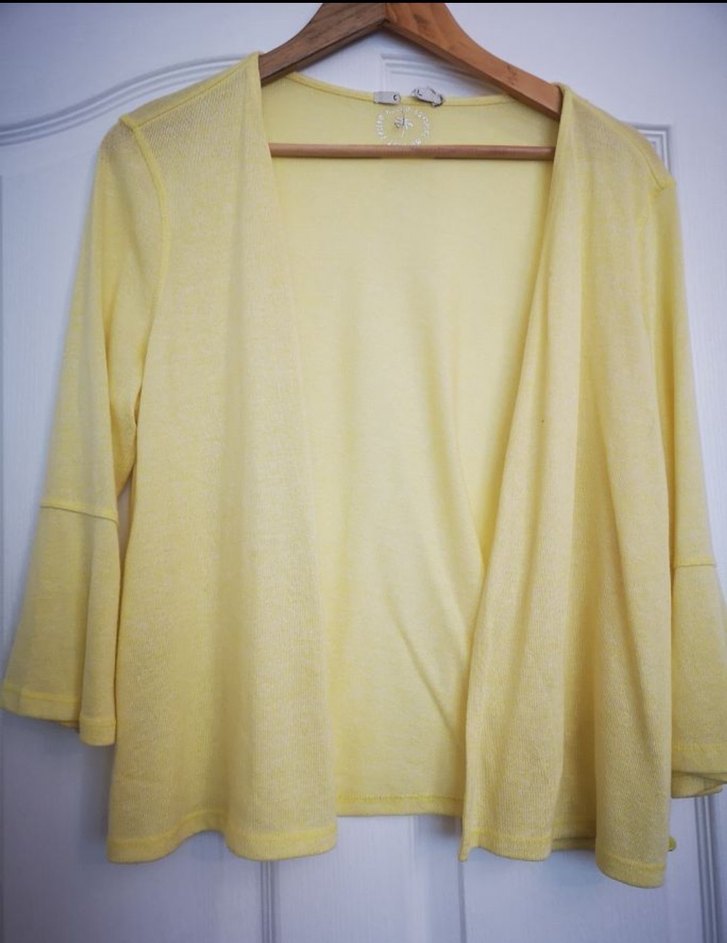 Sarı midi uzunlukta, baharlık-yazlık, V yaka, uzun kollu, kol uçlarına doğru hafif volanlı. Rahat ve sade görünüm sunar. Boy 59, iki koltuk arası 57, kol boy 46 cm.