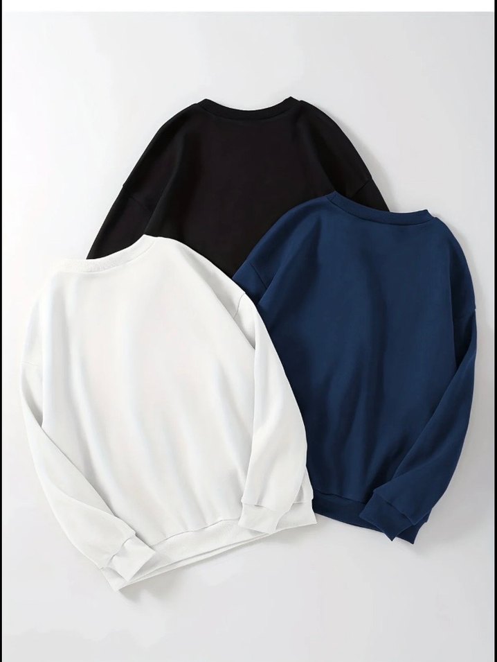 Kadınlar için yuvarlak yakalı, bol kesim, beyaz, siyah ve koyu mavi renk seçenekli, yumuşak ve sıcak kumaştan basic uzun kollu sweatshirt.