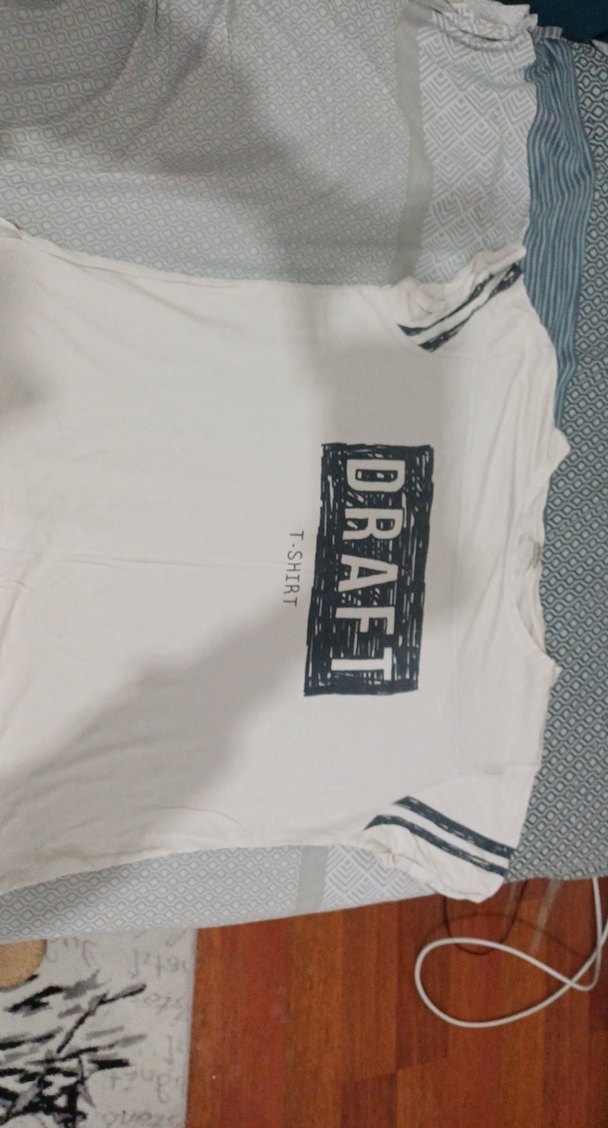 Pamuklu kumaştan yapılmış, kısa kollu, bisiklet yakalı ve bol kesim beyaz tişört. Üzerinde 'DRAFT' baskısı ve kol kısımlarında gri çizgiler bulunur.Ürünün yaka kısmında sararmalar vardır.Onun dışında iyi durumdadır.S beden ama M bedene de rahatlıkla olur.Ürün orijinaldir.
