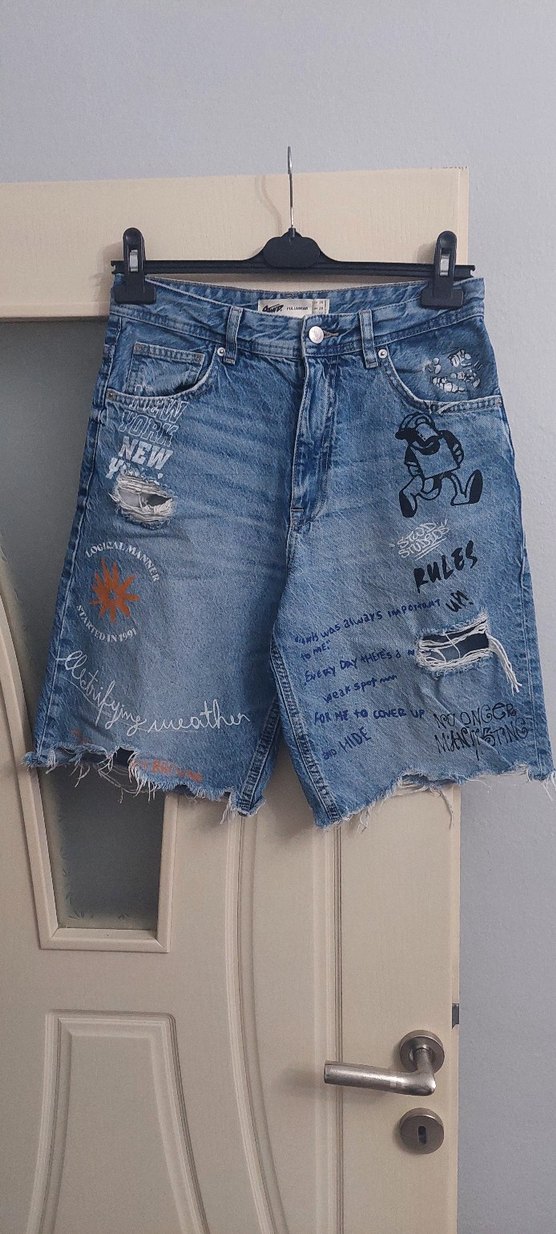 Az kullanılmış temiz 29/29 beden kadın kot şort.... Baskılı desenler ve tokalı detaylara sahip bol kesim mavi kot mini şort, sokak tarzını yansıtır. Günlük kullanım için uygundur.