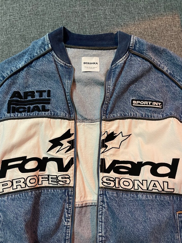 Uzun kollu, bisiklet yakalı kadın denim ceket. Fermuarlı, baskılı spor desenli ve regular fit. Mavi ve gri tonlarda günlük rahat kullanım için uygun.