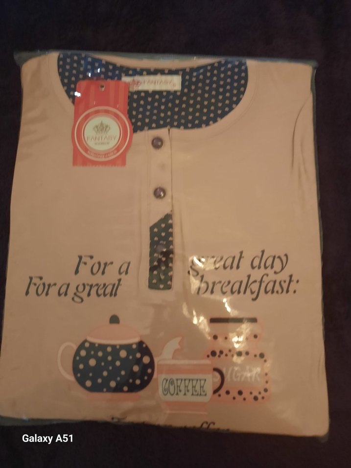 Kadınlar için kısa kollu, mini boy, bol kesim pijama takımı. Rahat bohem tarzda, beyaz üzerine baskılı, kahve temalı yazılar ve desenler içerir. ☕