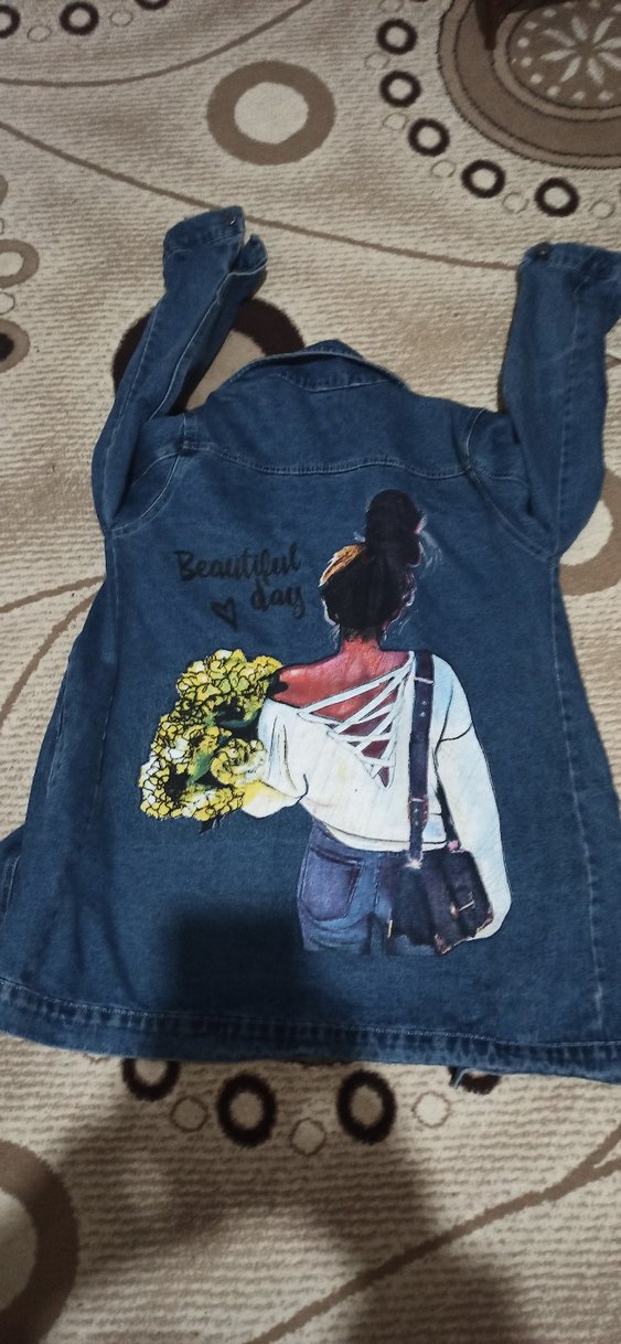 Uzun kollu, yuvarlak yaka, lacivert kadın kot ceket. Rahat kesim ve düğmeli, sırtında sarı çiçekler ve 'Beautiful day' yazılı baskı bulunur. Günlük kullanıma uygun.sayılı kullanıldı